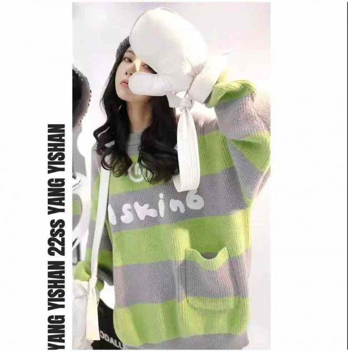 秋冬新款大码宽松休闲慵懒风字母印花口袋条纹粗针圆领...