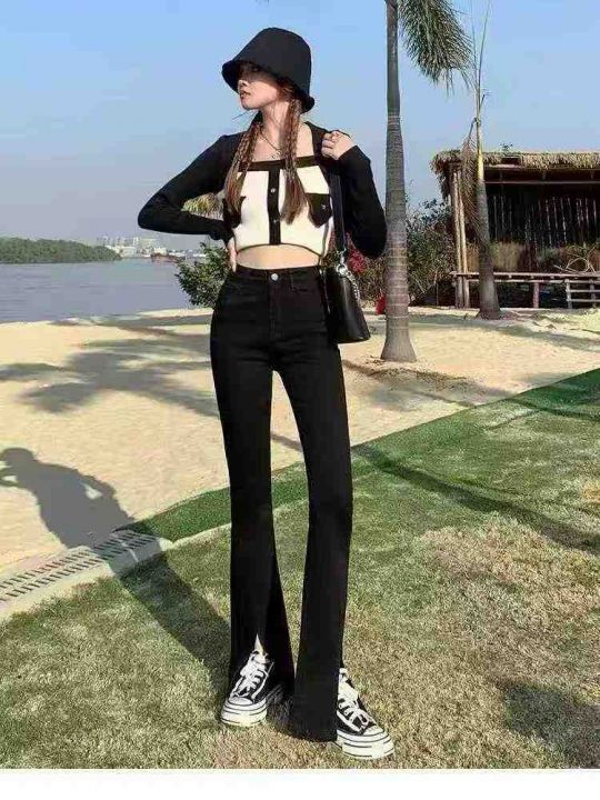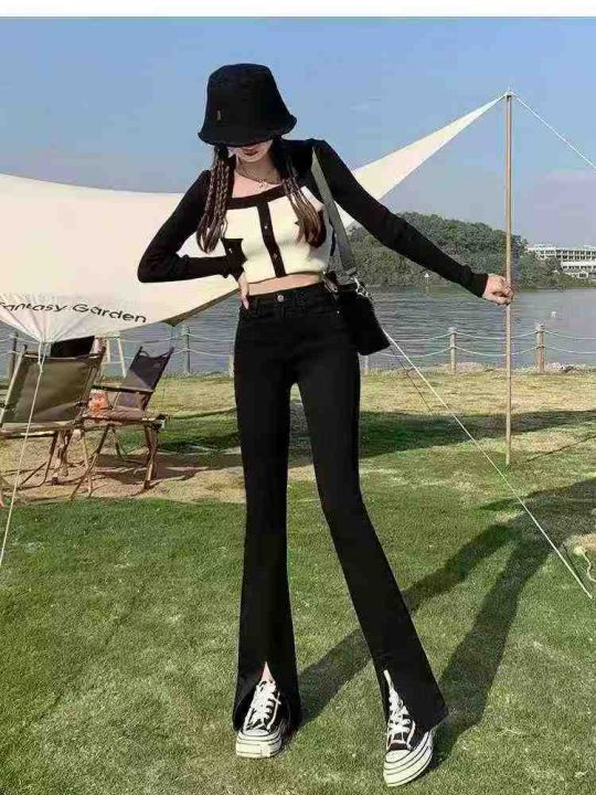 清9.8黑色开叉微喇牛仔裤女春秋季新款爆款喇叭裤,带...