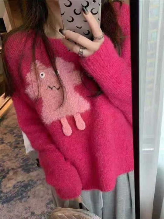 秋冬新款宽松韩系复古慵懒风小怪兽立体图设计款圆领羊...