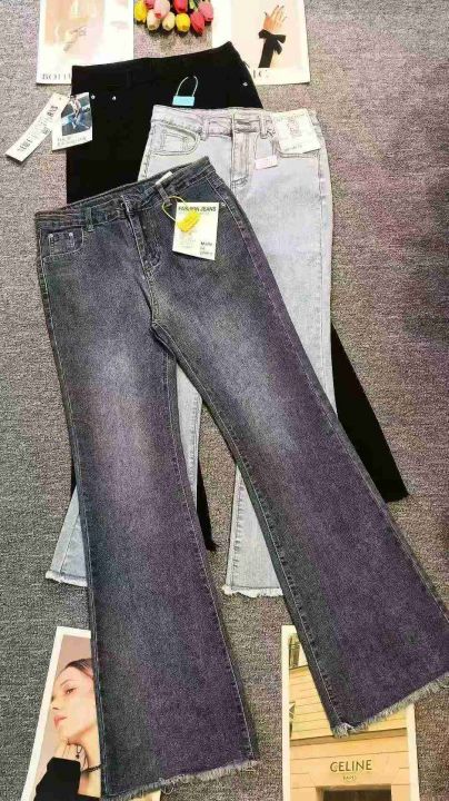 复古高腰弹力百搭显瘦微喇牛仔裤,[爱心]700件左右,三个颜色,三种裤型,九分,常规,加长,码数XS-2XL,穿70-140斤,万佳档口货,原包装️无瑕疵,[666]实体店品质,分货加一