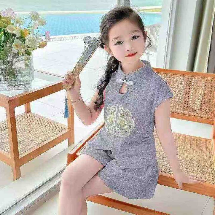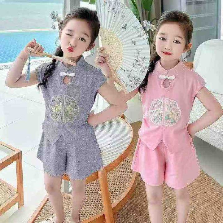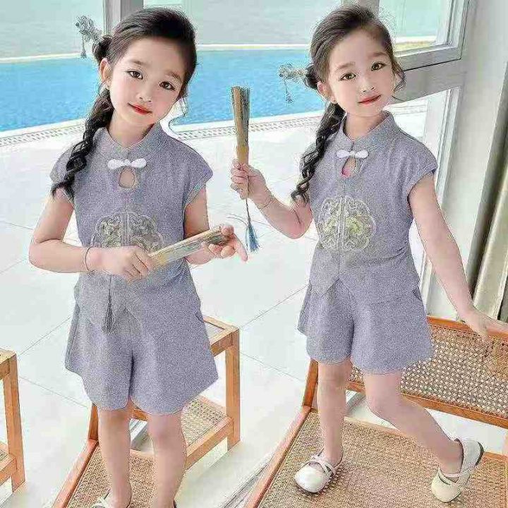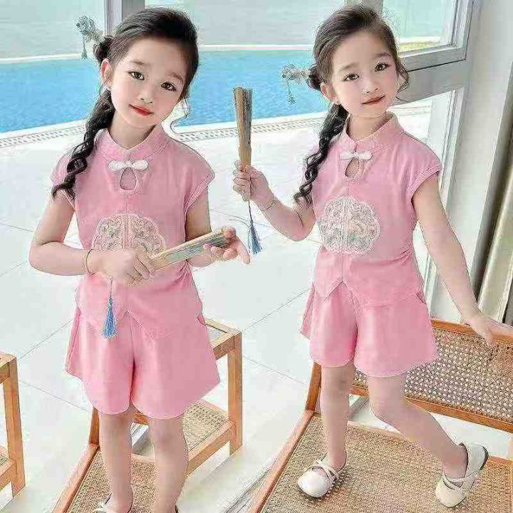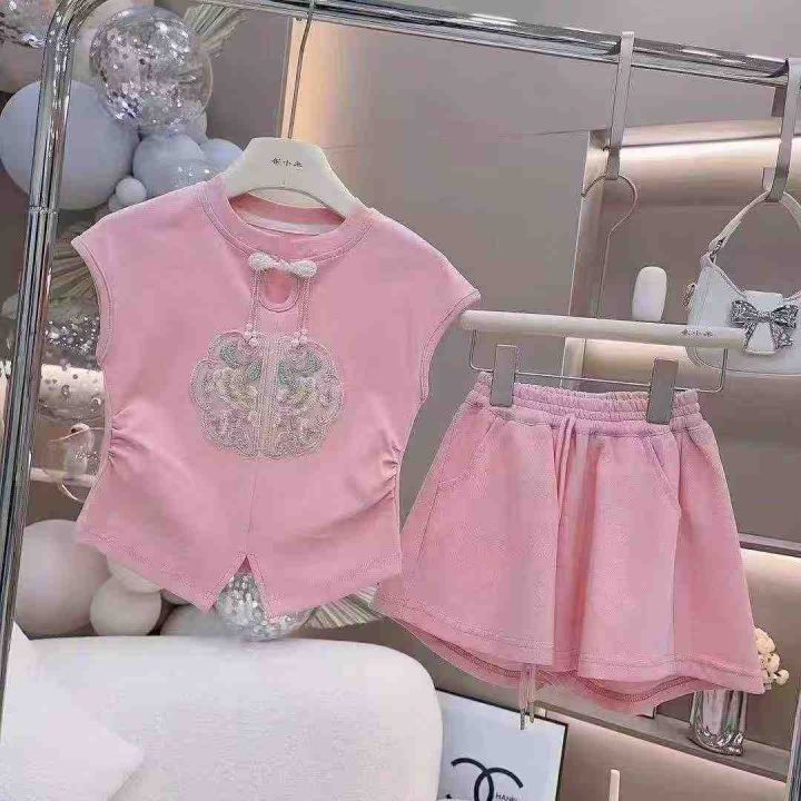 2025新款新中式国风潮流夏装女儿童装宝宝短裤两件套,...