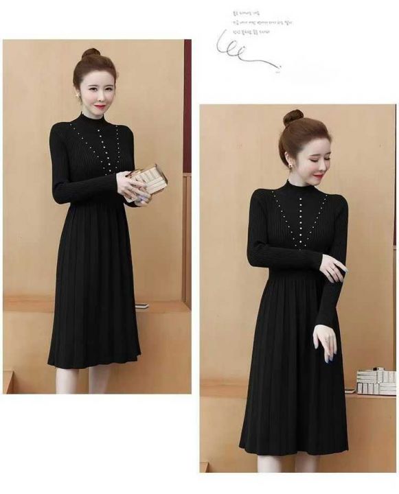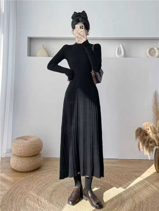 秋冬新款法式复古黑色大长款包芯纱套头毛衣连衣裙,独...