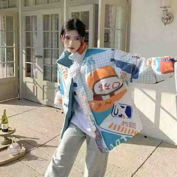 300左右\'两面穿涂鸦立领棉衣女冬季潮流chic加厚棉袄百保暖情侣面包服外套,独立包装,码数:M-2XL,全清29.8元,分货➕1