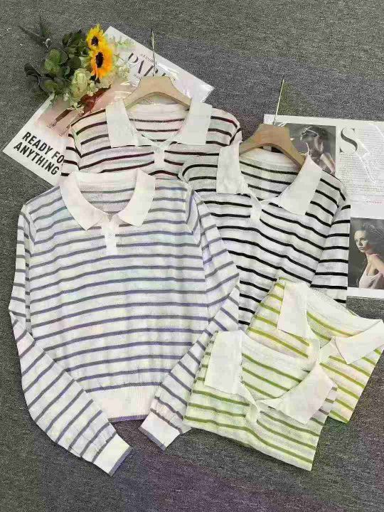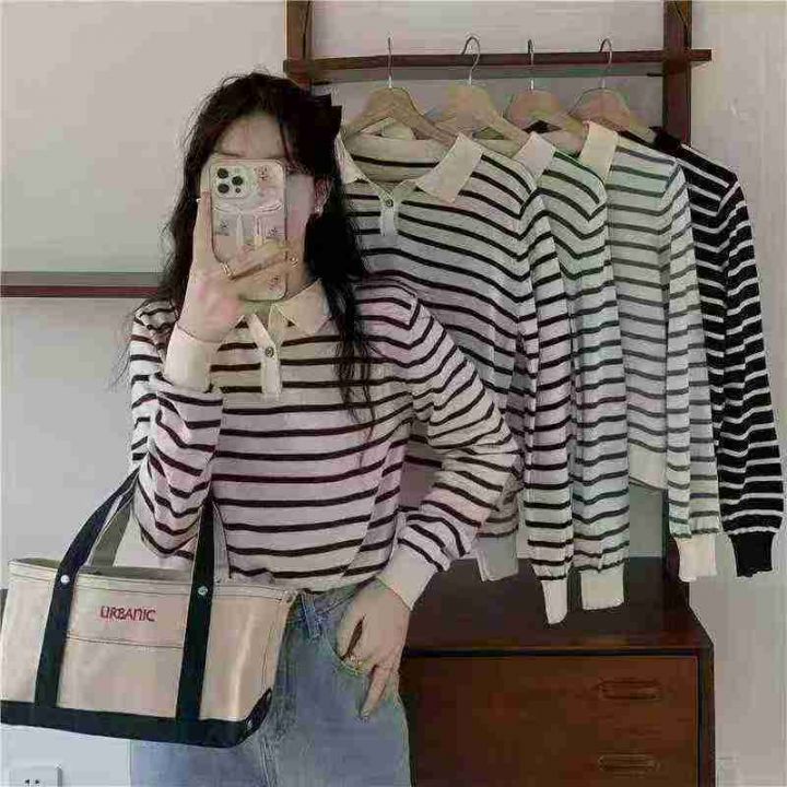 早秋新款韩系宽松高级感撞色条纹百搭POLO领长袖针织毛...