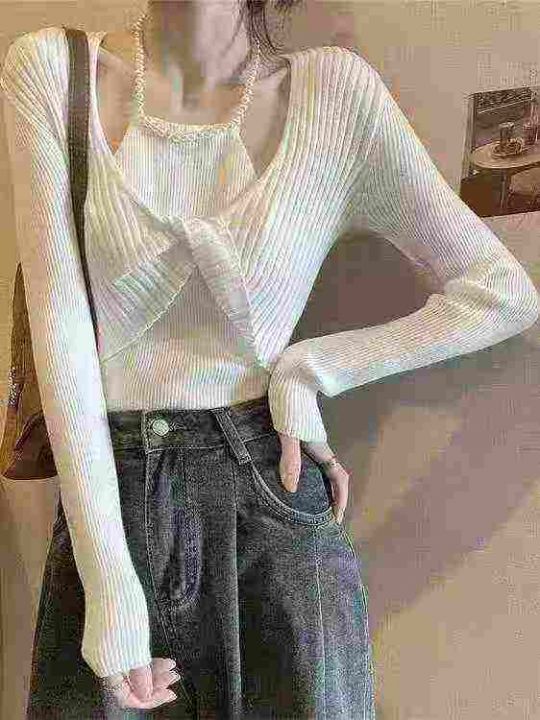 设计感珍珠挂脖链条长袖针织衫女春秋辣妹扭结短款修身上衣打底衫,独立包装...