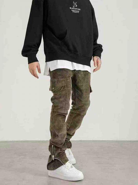142条\'街复古做旧灯芯绒拉链修身工装裤国潮机能休闲...