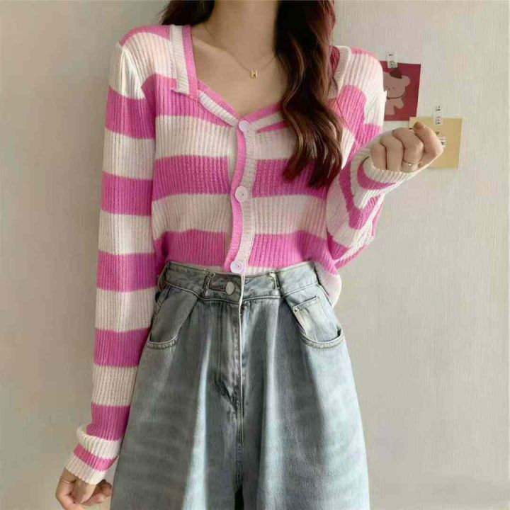秋冬新款韩系撞色条纹高级感针织毛衣开衫,独立包装均码面料软糯舒适弹力大,469件,全清6.9元超低价秒杀!分货加一!