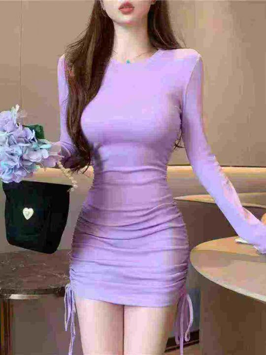 性感紫色长袖连衣裙女春季新款辣妹薄款包臀紧身显瘦圆...