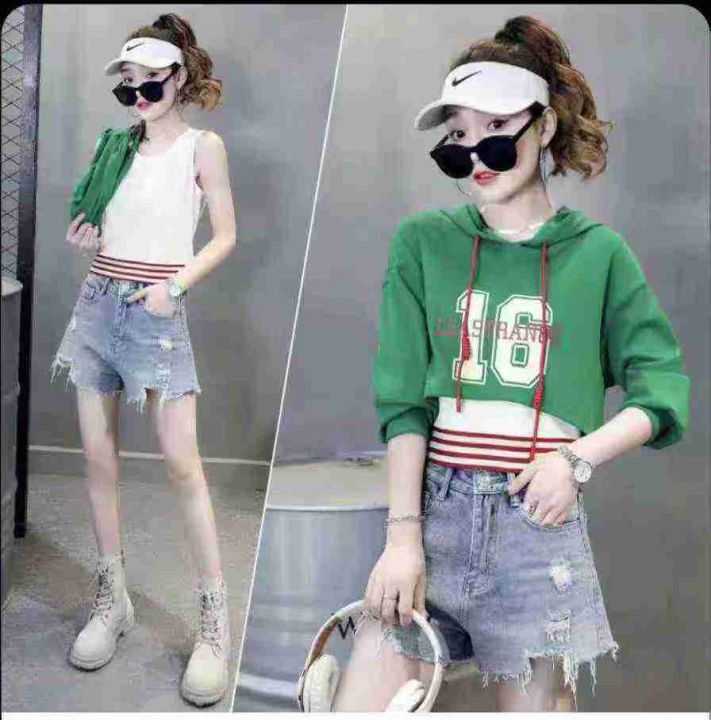 时尚短款连帽卫衣背心两件套秋季上衣女装新款宽松长袖...