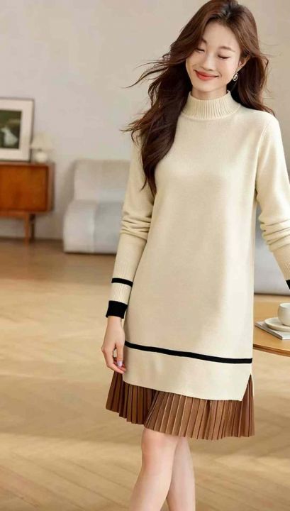 冬季新款配大衣中长款加绒加厚拼接宽松半高领针织连衣裙,独立包装带吊牌,均码面料软糯厚实弹力大,50件左右,全清8.9元超低价秒杀!