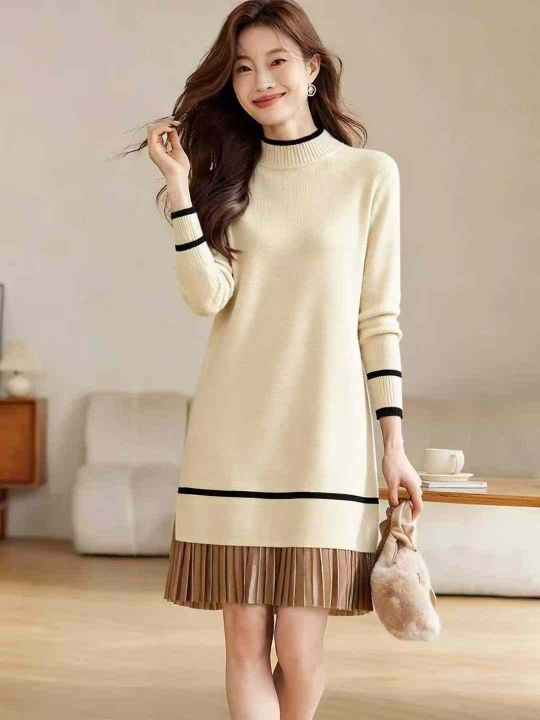 冬季新款配大衣中长款加绒加厚拼接宽松半高领针织连衣...