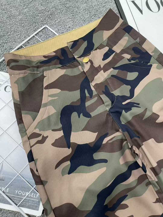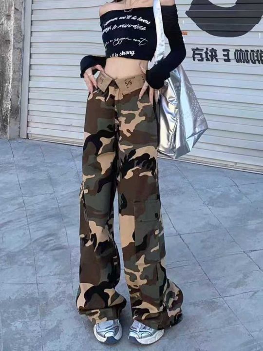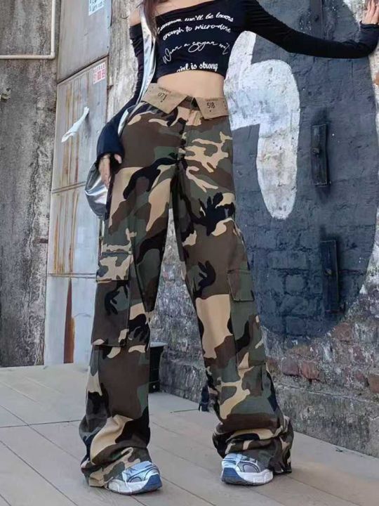 翻腰字母刺绣迷彩工装牛仔裤女美式辣妹复古百搭高腰宽...