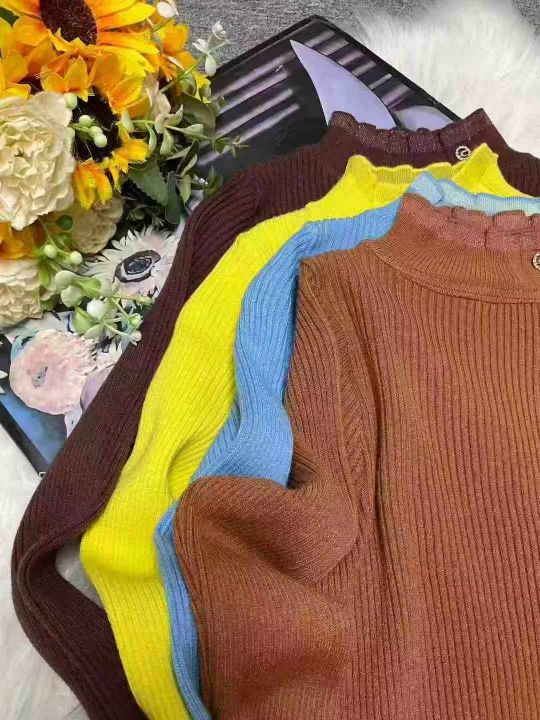 秋冬新款半高领拼接设计款弹力修身显瘦纽扣包芯纱套头毛衣,独立包装,均码...