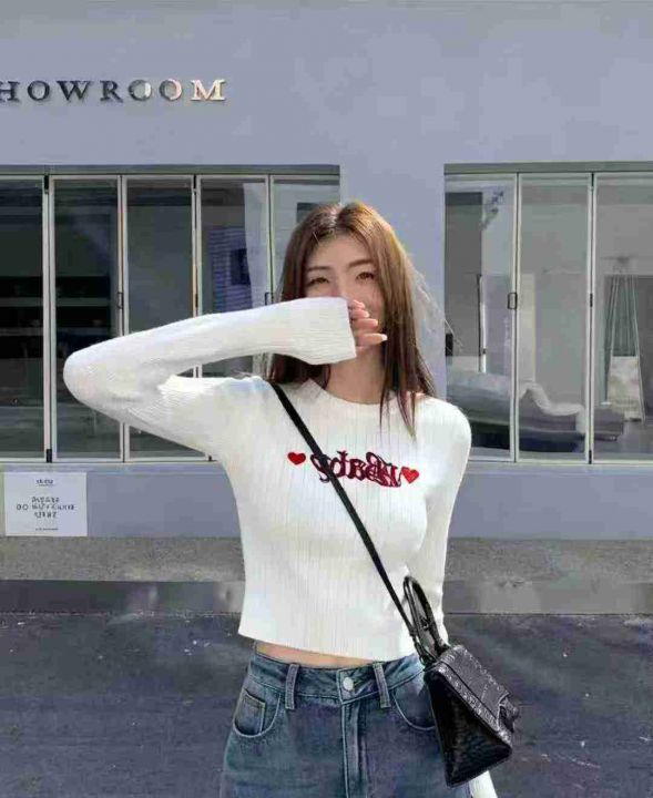 秋季新品纯欲甜辣短款字母刺绣针织长袖圆领套头毛衣,...