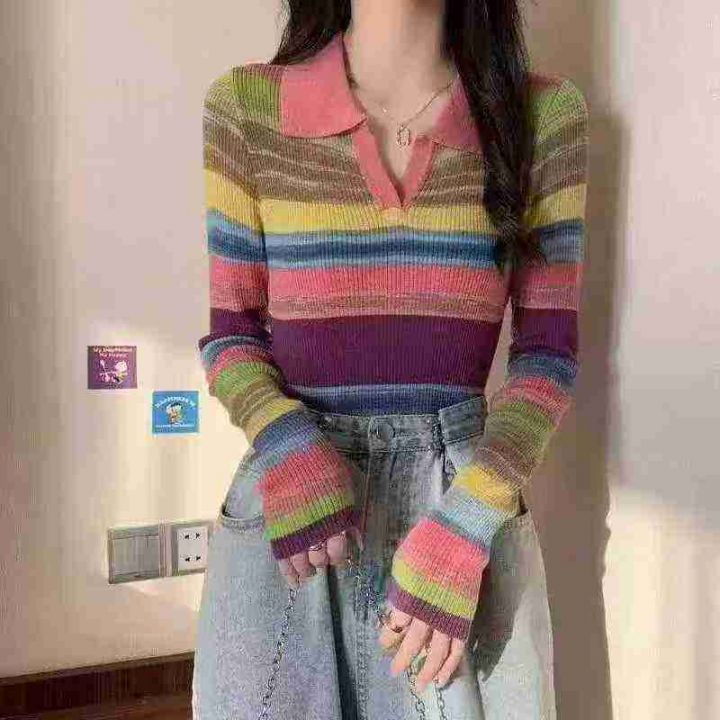 秋季新款POLO领撞色彩虹条纹微胖MM设计感时尚宽松长袖套头毛衣羊毛衫,独立包装,均码宽松款面料软糯Q弹,2800件,全清8.9元超低价秒杀!分货加一!