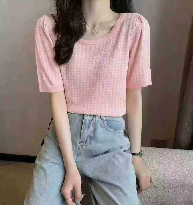 夏季新款冰丝法式独特别致质千鸟格针织短袖,独立包装...