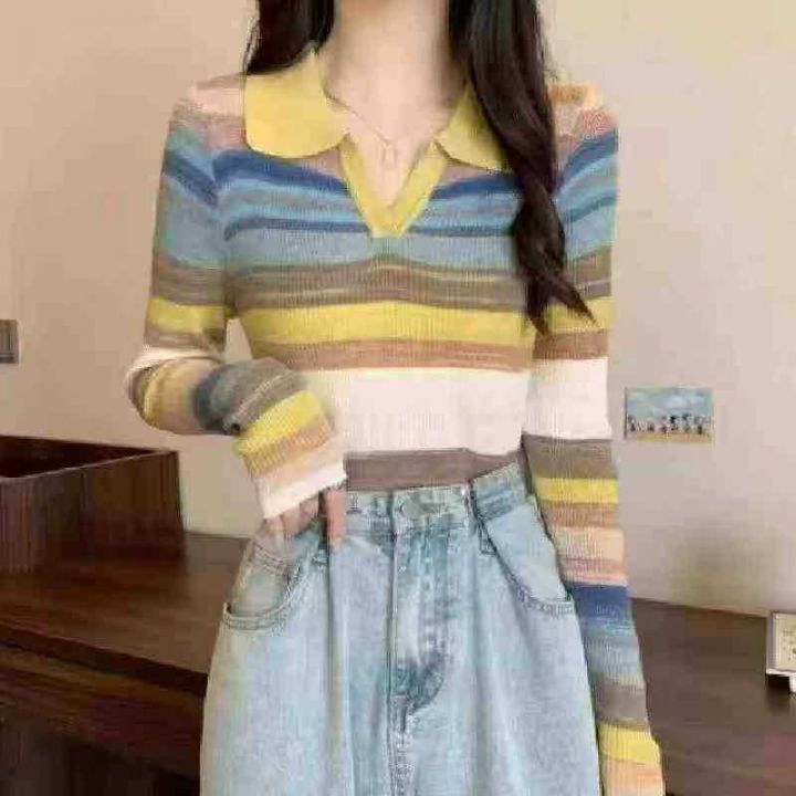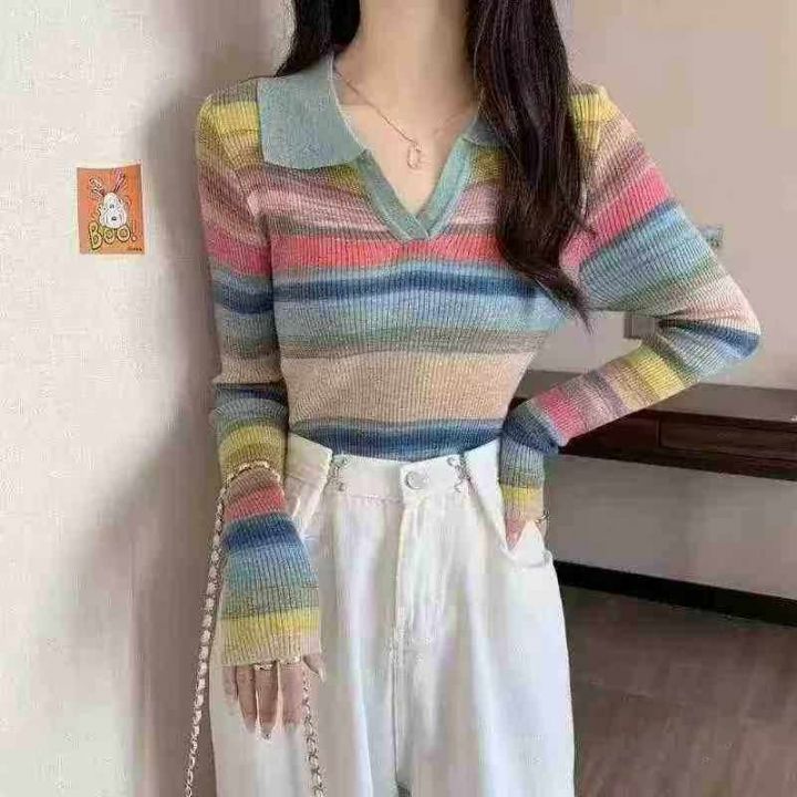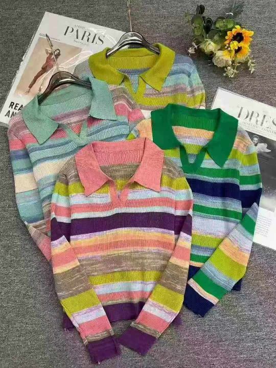 秋季新款POLO领撞色彩虹条纹微胖MM设计感时尚宽松长袖套头毛衣羊毛衫,独立包装,均码宽松款面料软糯Q弹,2800件,全清8.9元超低价秒杀!分货加一!