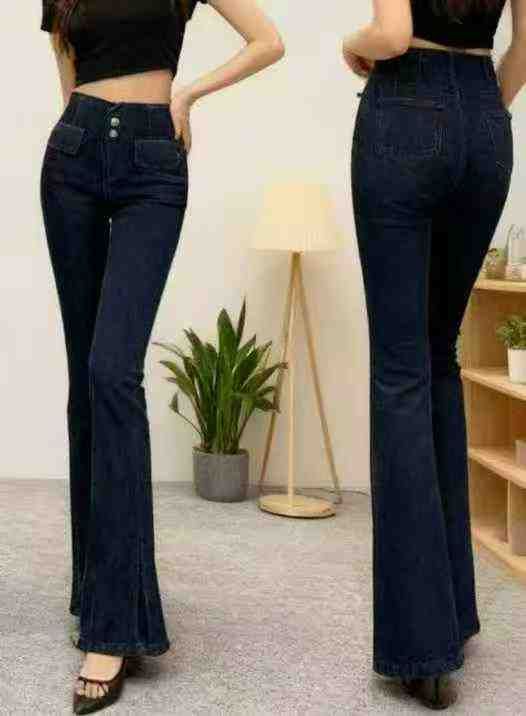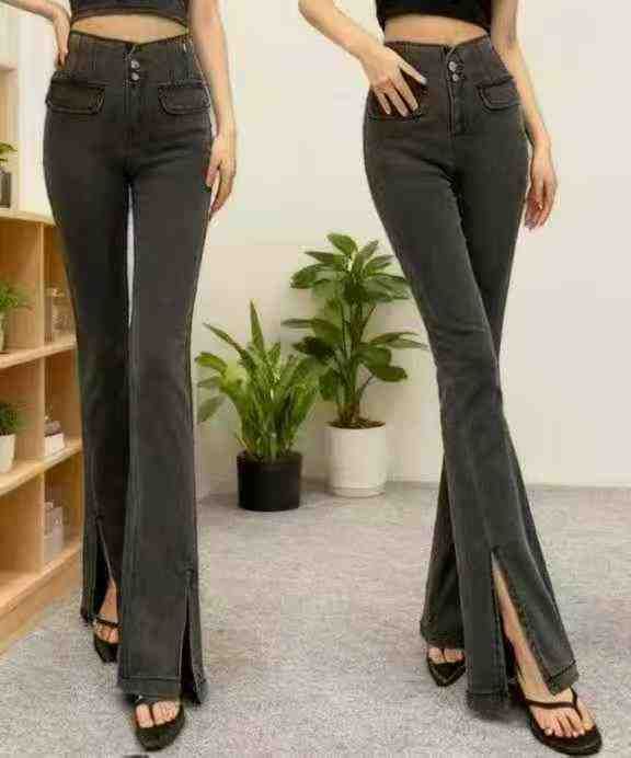 秋季新品高弹力洗水棉网红爆款牛仔开叉微喇叭牛仔裤,...