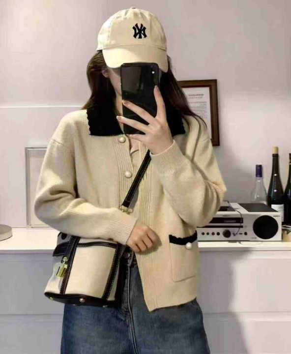 早秋新款小香风撞色翻领温柔风减龄百搭宽松显瘦毛衣开...