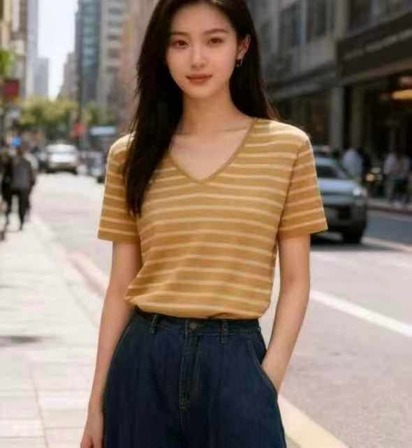 夏季新款撞色条纹V领冰丝针织短袖,独立包装,均码面料软糯舒适弹力大,186...