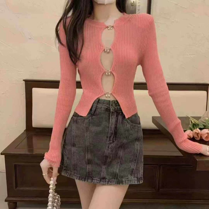 秋季新款美式辣妹镂空长袖弹力修身显瘦性感纯欲针织套...