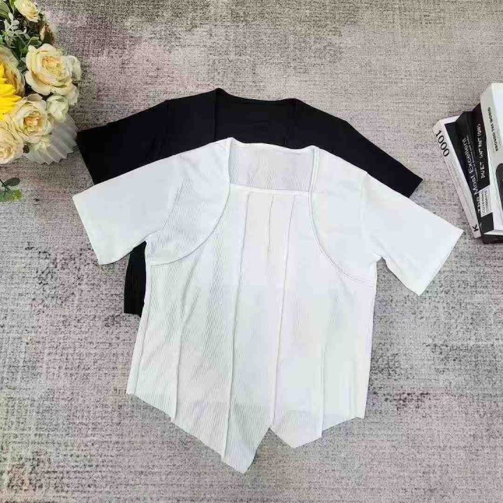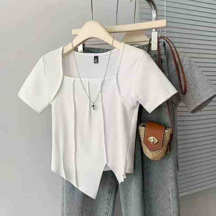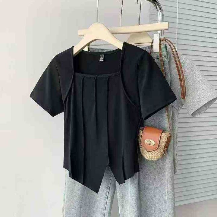 设计感靓妹冰丝方领短款显瘦正肩短袖t恤200件,码数1-6,独立包装