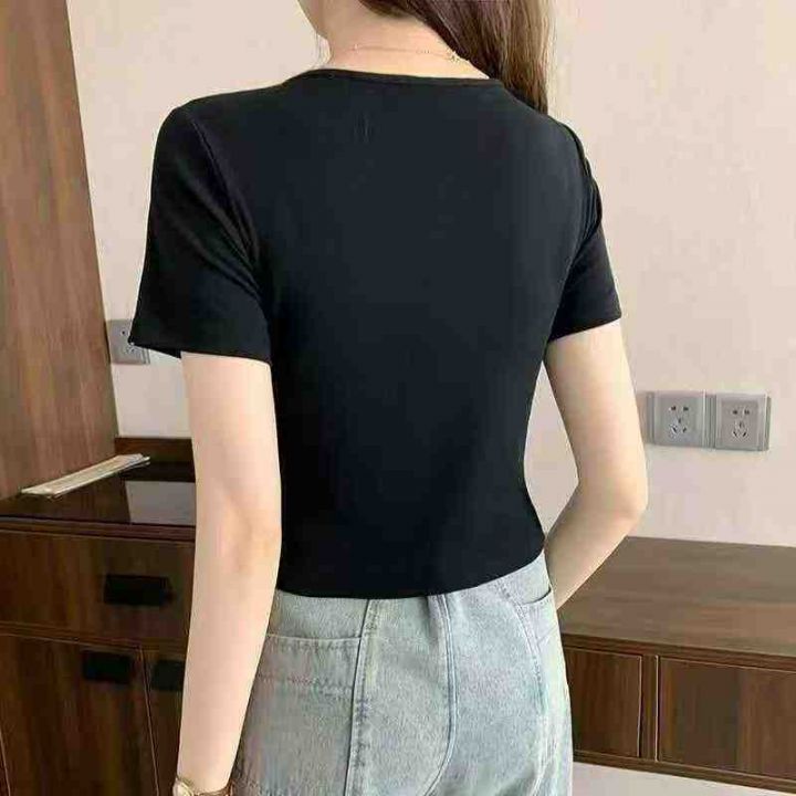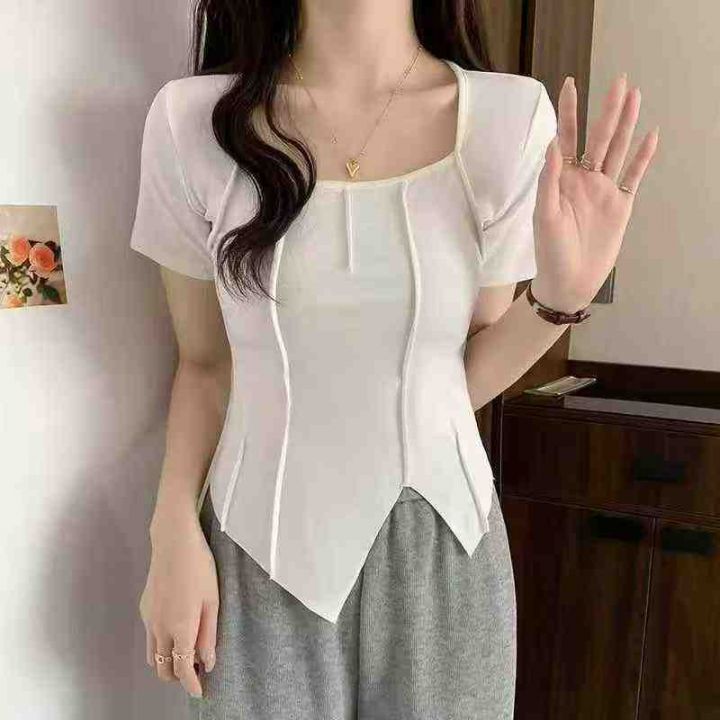 设计感靓妹冰丝方领短款显瘦正肩短袖t恤200件,码数1-...