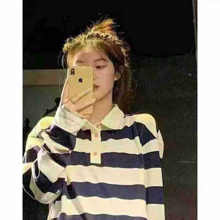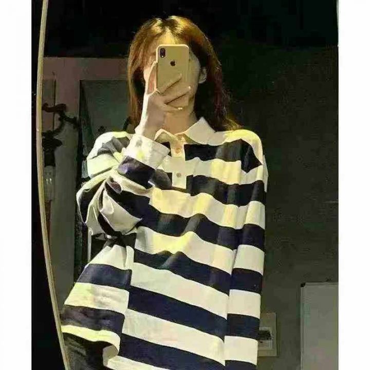 春秋薄款撞色条纹polo领棉质T恤潮牌小众设计感宽松别...