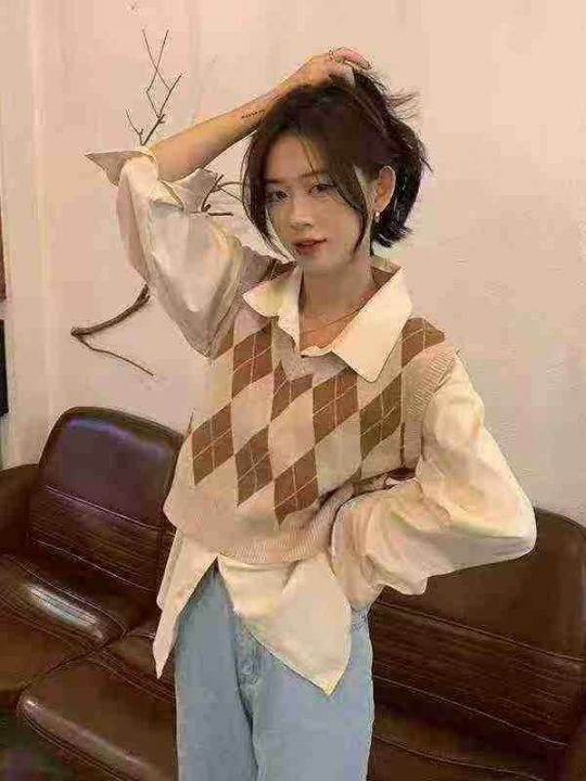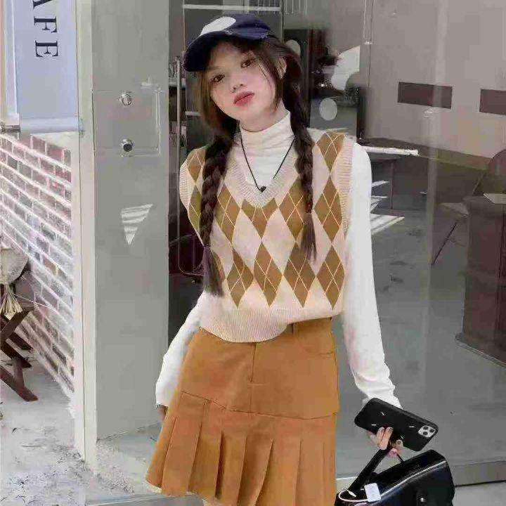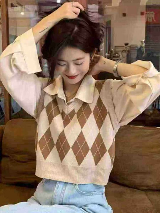 复古咖色菱形格纹马甲女2025春秋新款V领短款针织上衣宽松坎肩外穿潮,独立包装,均码,510件,清5.5,分➕1