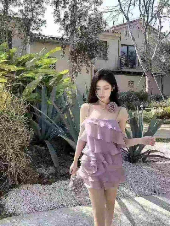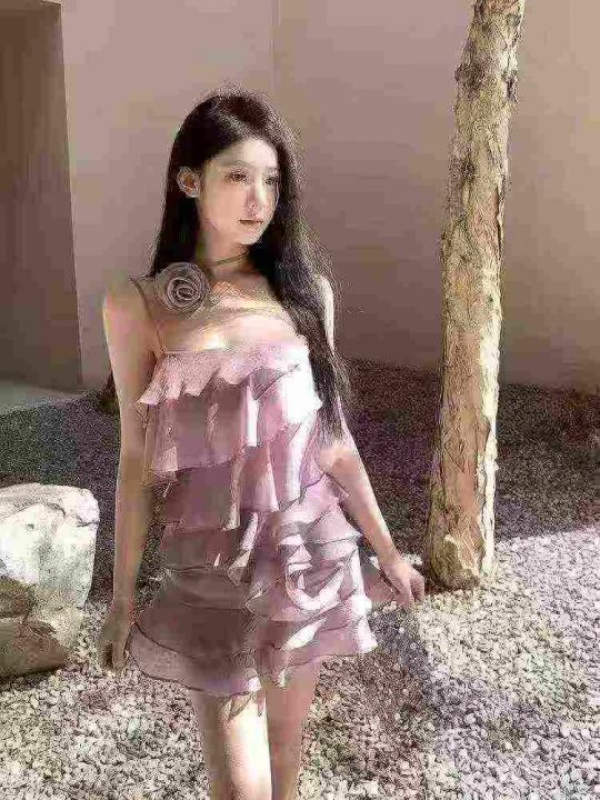 ☕️仙女裙辣妹不规则荷叶边吊带连衣裙短款花朵纯欲海...