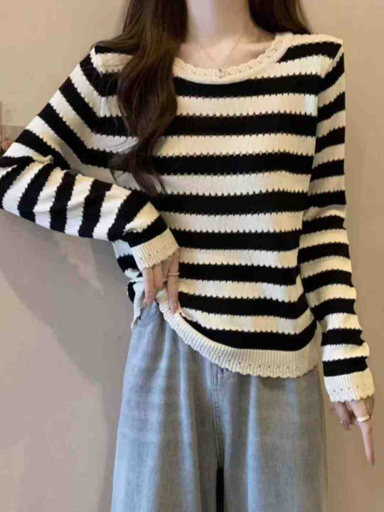 春秋新款撞色条纹时尚百搭宽松韩版针织毛衣套头毛衣,独立包装,均码面料柔...