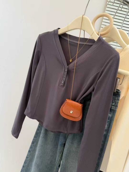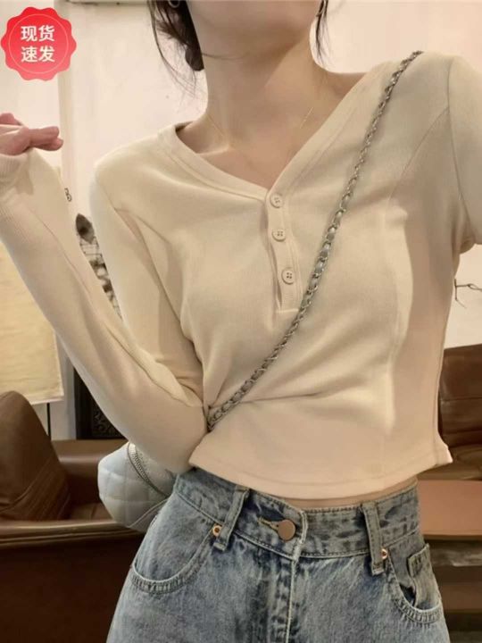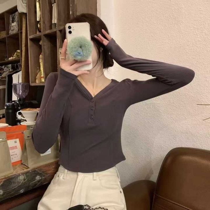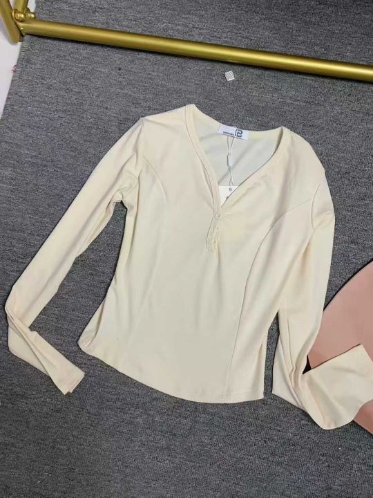 7.8清3500件纯棉辣妹靓妹修身百搭设计感显瘦V领长袖T恤女春秋季新款纽扣设计感打底上衣 ,码数均码 独立拉链包装 有吊牌 分货加一