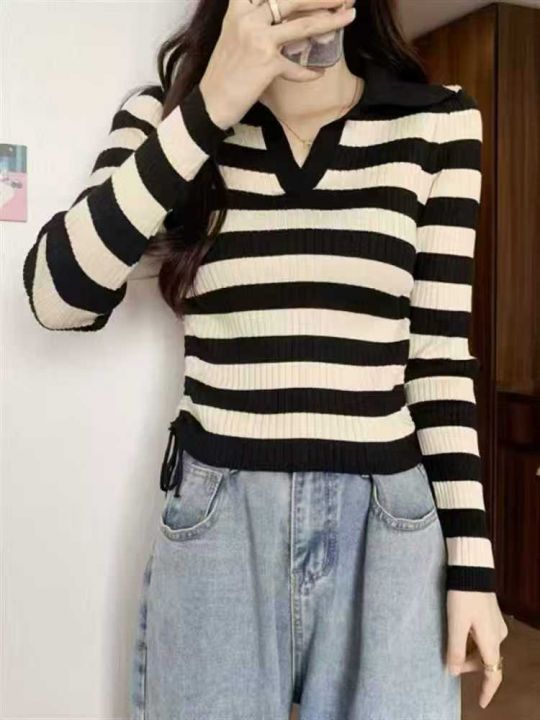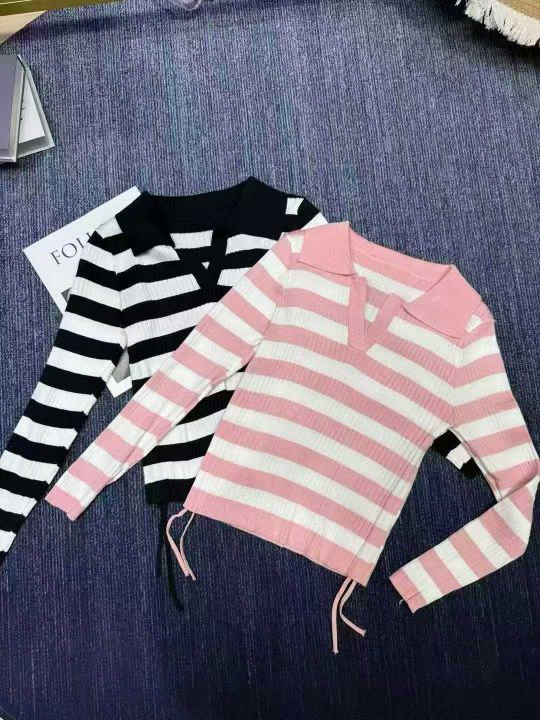 淘宝在售爆款条纹针织衫女春秋款洋气v领毛衣内搭设计感抽绳修身显瘦上衣,总数900件,独立原包装,清货7.5元,分货加0.5元