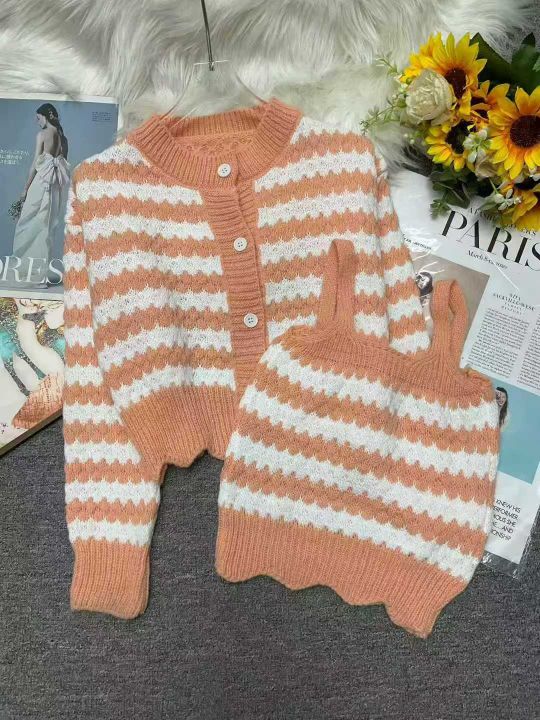 秋冬新款韩系小香风撞色条纹针织开衫+毛衣吊带套装两件套,独立包装,均码...