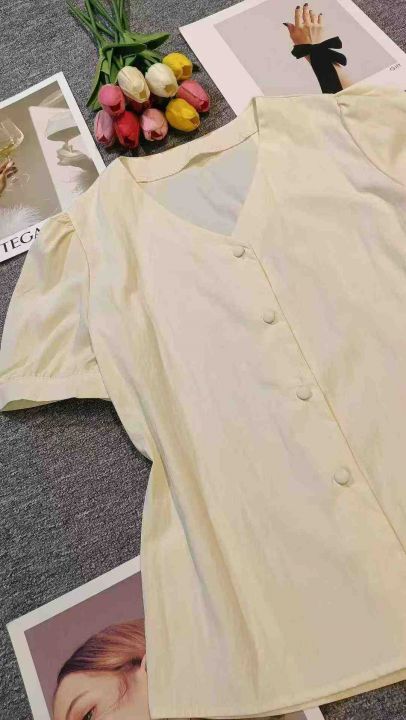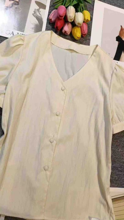 法式气质独特别致V领杏色泡泡袖上衣,[爱心]60件左右,款号#7049,码数M-2XL,穿80-140斤,万佳档口货,原包装️无瑕疵,(模特图仅供参考),[666]实体店品质