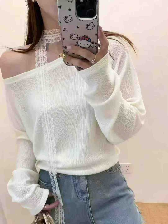 秋季新品十三行温柔甜美蕾丝飘带宽松慵懒风圆领长袖针...