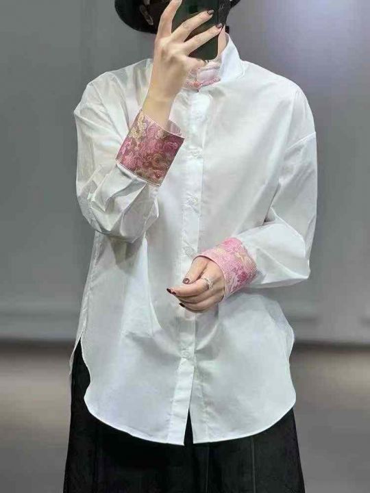 新中式立领衬衫70件11.8,拼接袖口,弧形下摆,珍珠袖...