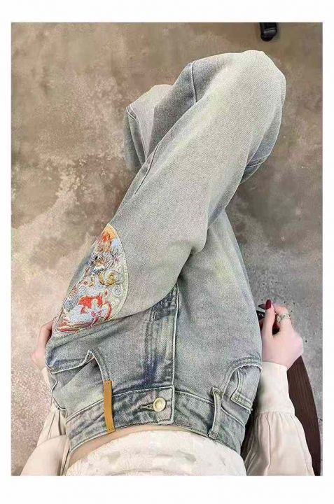 秋季新款洗水棉网红复古国风刺绣直筒阔腿牛仔长裤,独...