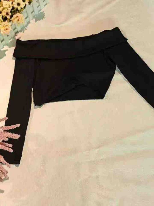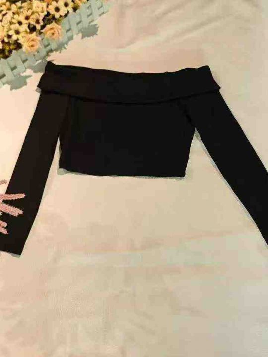 辣妹一字肩 黑色长袖t恤 女秋季短款 修身打底衫高级性感露肩上衣 螺纹面料 质量很好 码数s~xl 总数145件 全清6.8[烟花][烟花]