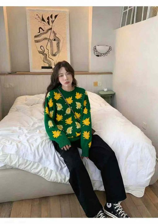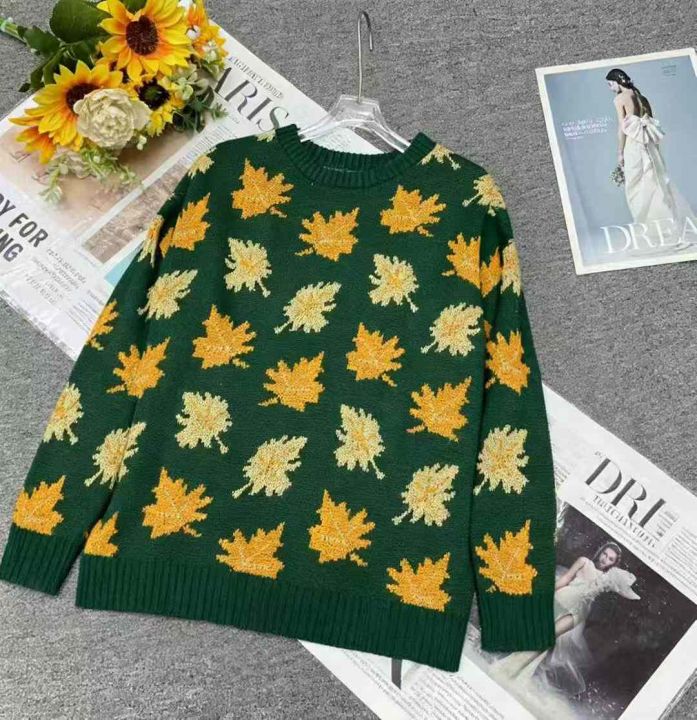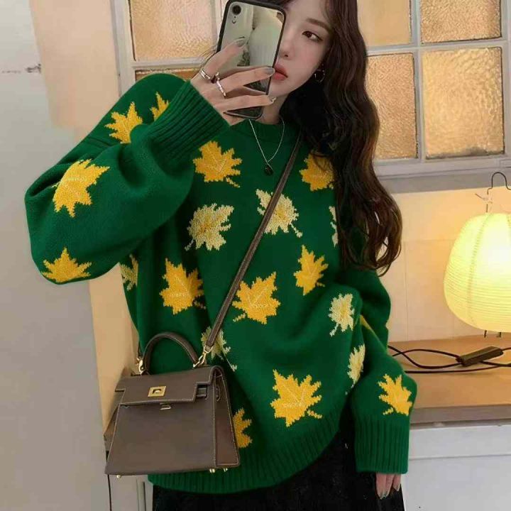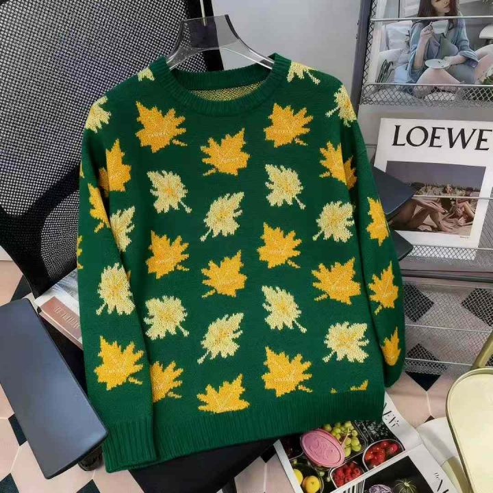 秋季新品大码宽松慵懒风枫叶提花圆领套头毛衣,独立拉...