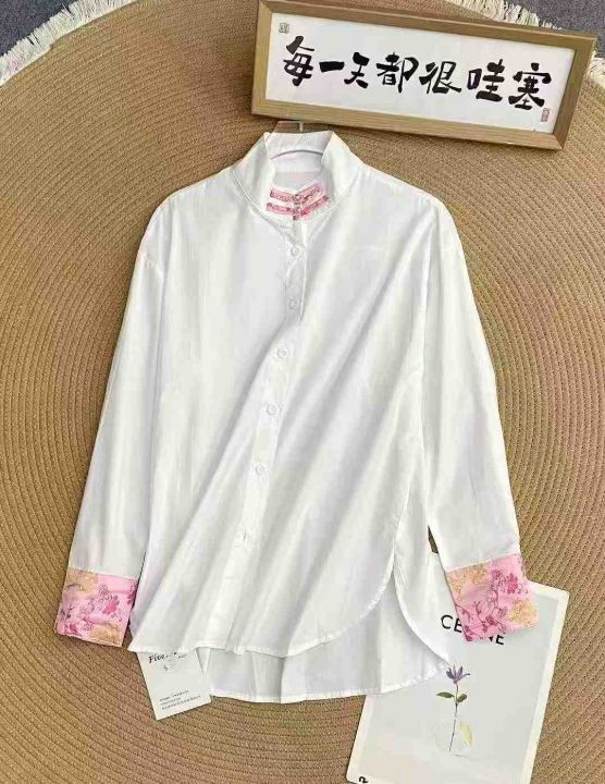 新中式立领衬衫70件11.8,拼接袖口,弧形下摆,珍珠袖...