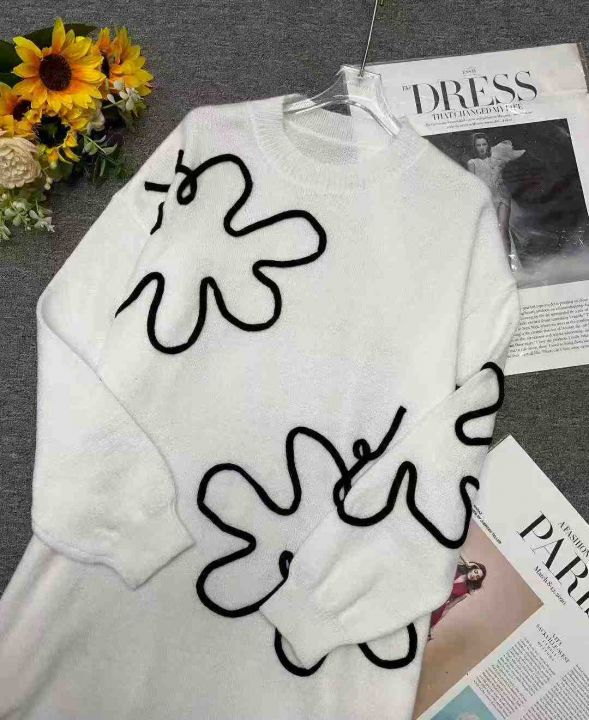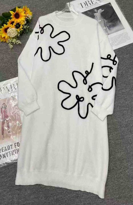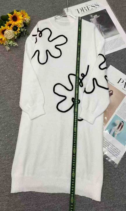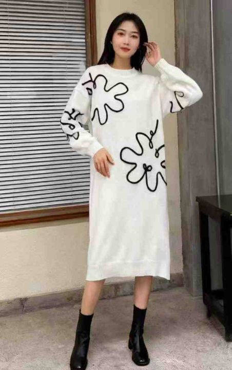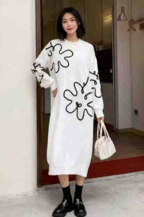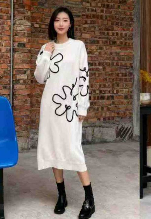 秋冬新款宽松慵懒风刺绣加厚中长款毛衣连衣裙,独立包...