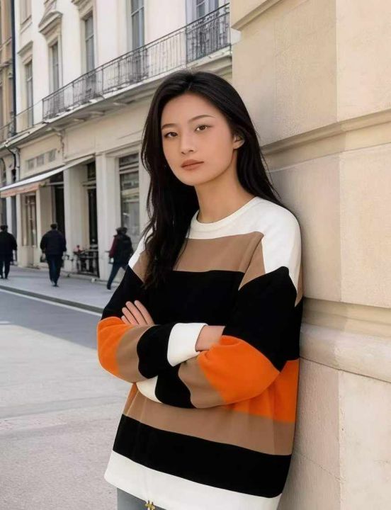 捡漏款,春秋新款宽松大版撞色条纹设计款圆领包芯纱套头毛衣,独立包装,码...
