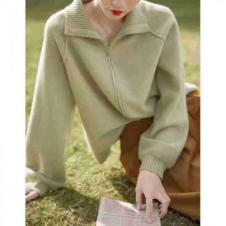 全清13.8,绿色翻领上衣法式复古拉链针织开衫秋新款外穿休闲宽松...