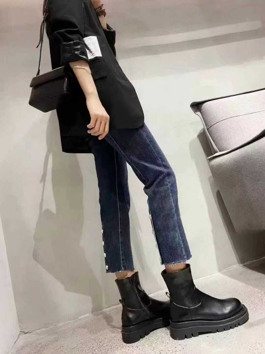 新款牛仔裤女开叉纽扣时尚弹力显瘦欧货排扣九分烟管裤...