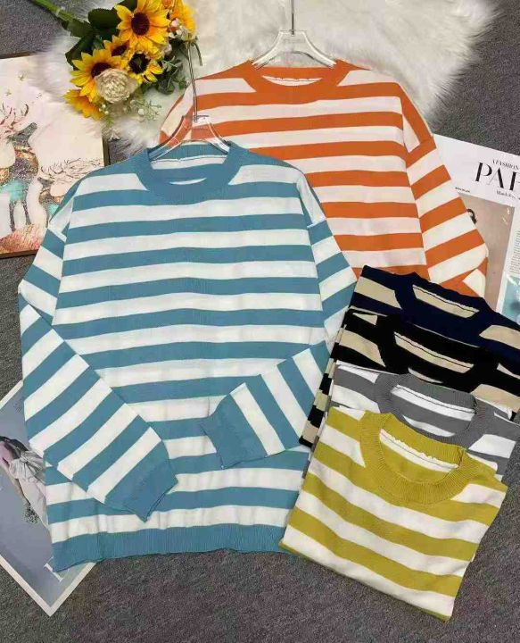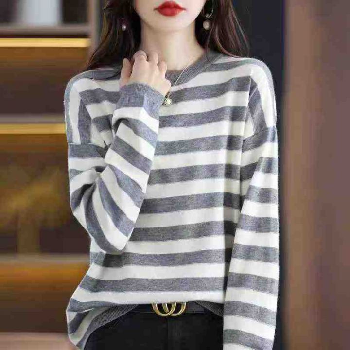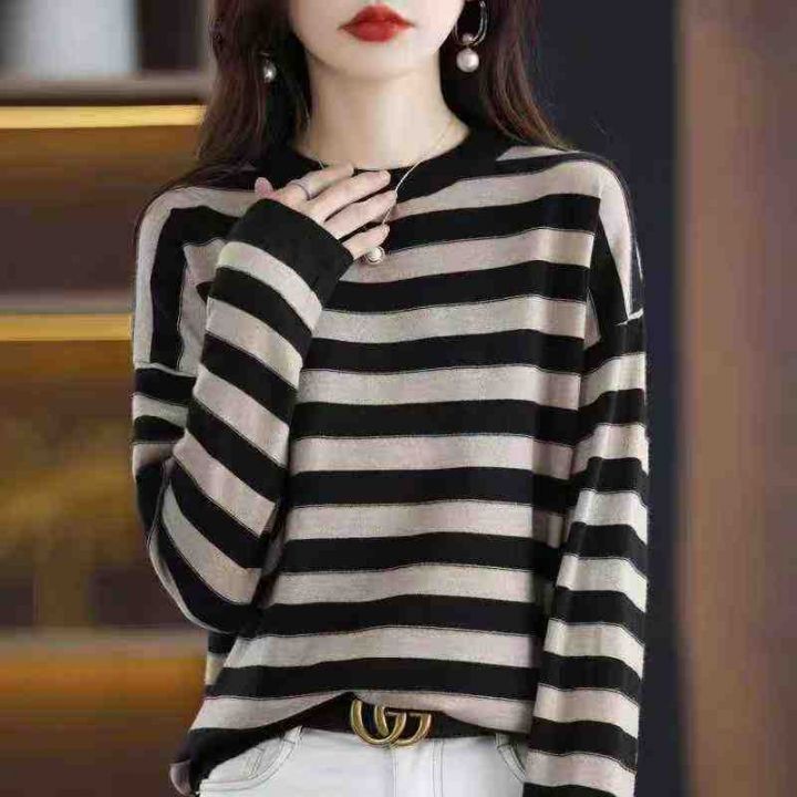 秋冬新款宽松百搭撞色条纹圆领针织套头毛衣,独立包装...