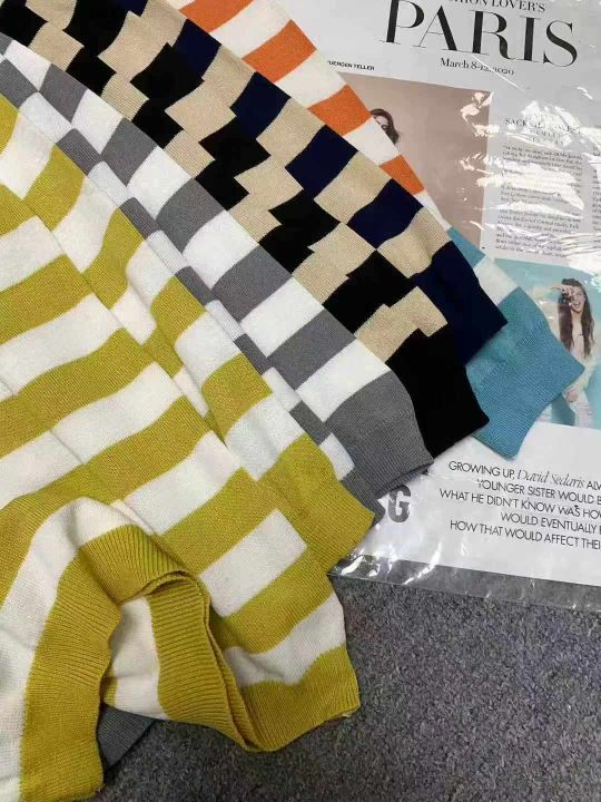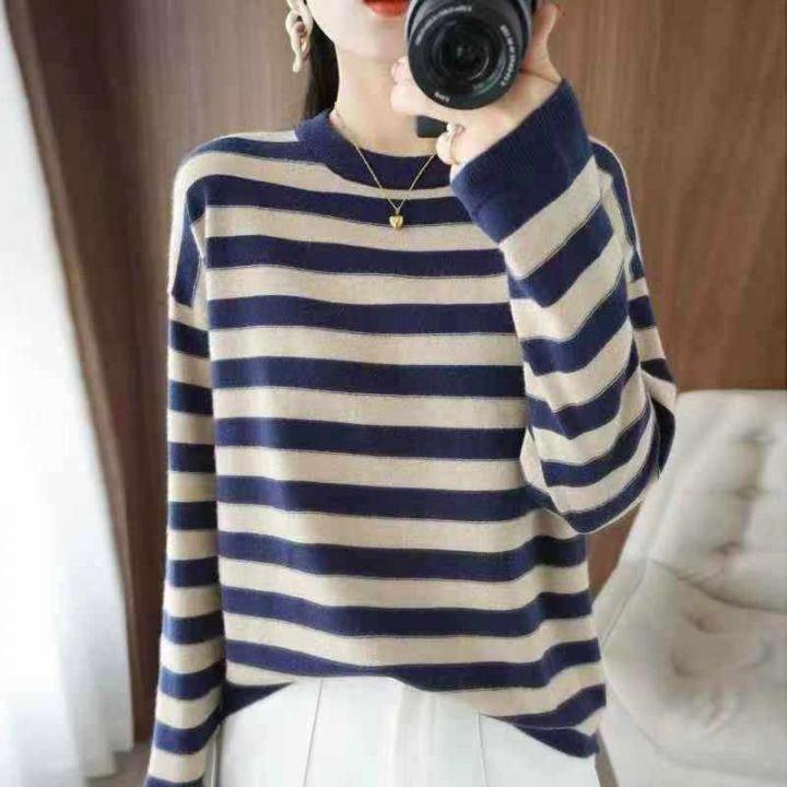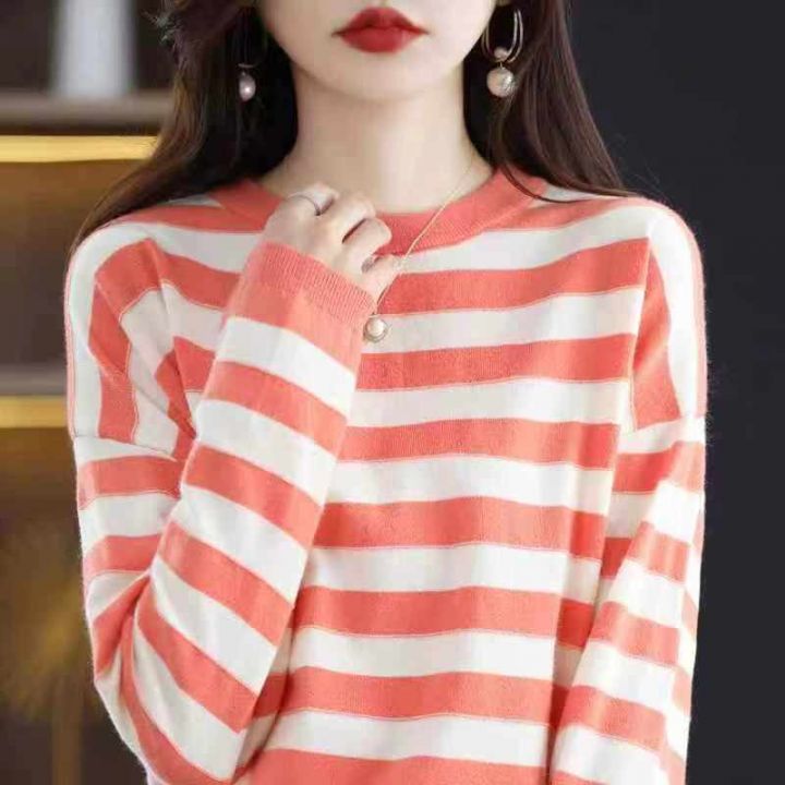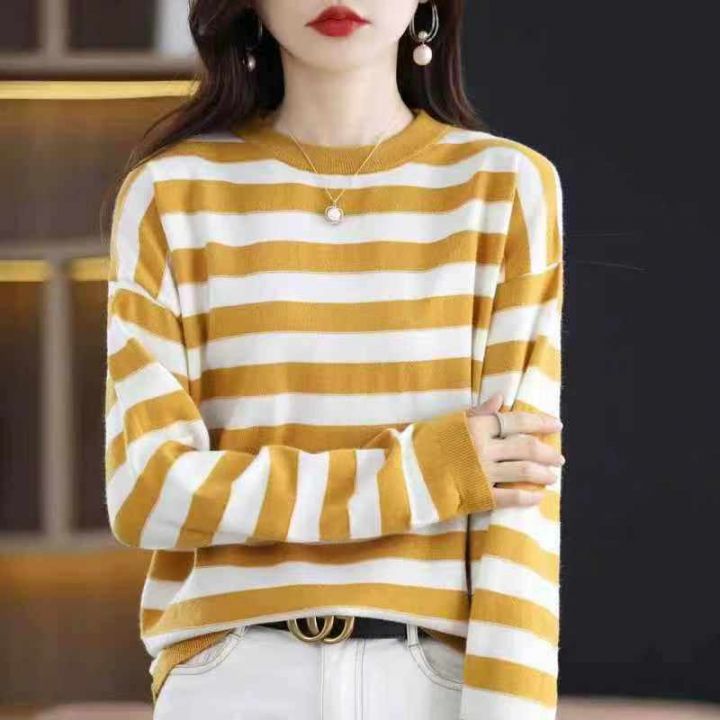 秋冬新款宽松百搭撞色条纹圆领针织套头毛衣,独立包装...
