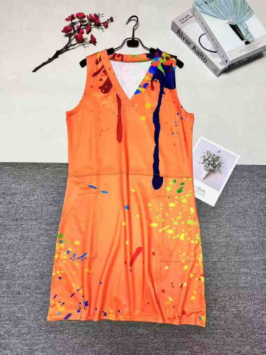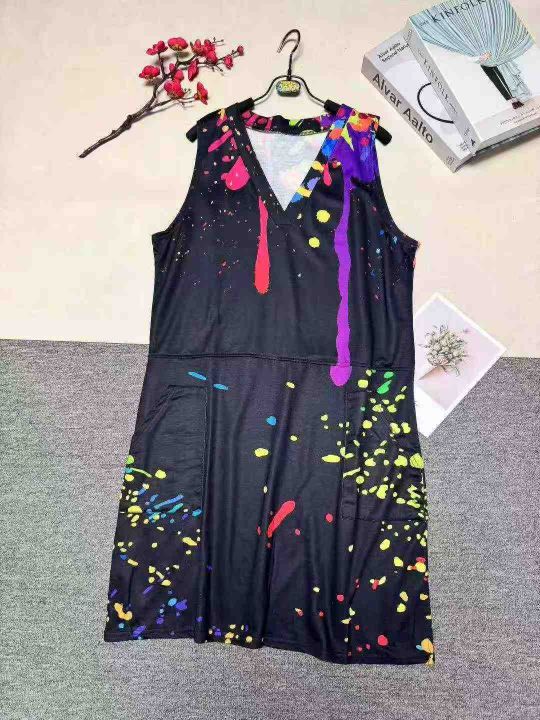 欧美女装V领印花无袖连衣裙,整款多色,数量200条,码数S-2XL,拉链式独立包装。