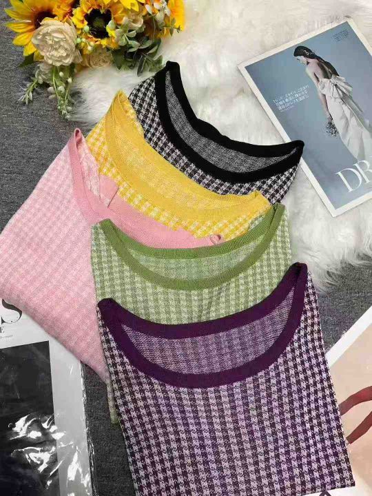 夏季新款冰丝法式独特别致质千鸟格针织短袖,独立包装...