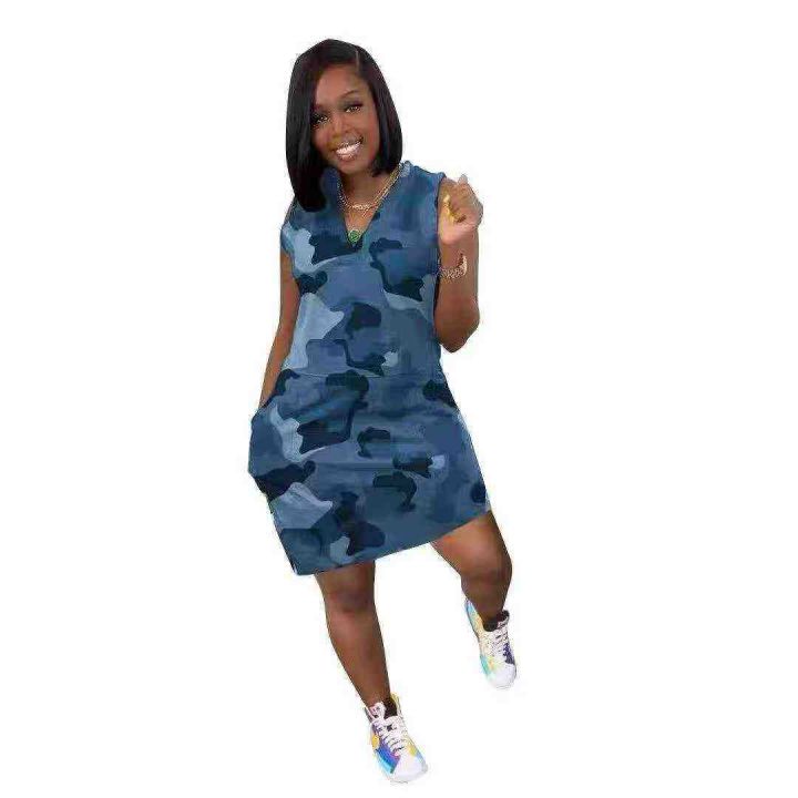 欧美女装春夏季新品 休闲时尚个性无袖迷彩连衣裙,整款三色,数量400条,码数S-2XL,高弹力品质好,拉链式独立包装。